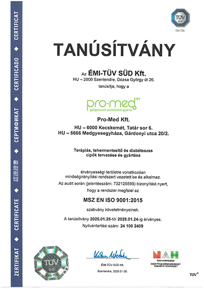 Vállalkozásunk által készített terápiás cipők kiváló minősége cégünk védjegye. A minőség mindennapi tevékenységünk és döntéseink meghozatalakor is fő szempontként van jelen. Folyamatosan magas minőséget csak egy hatékonyan működő minőségirányítási rendszer kiépítésével és fejlesztésével lehet fenntartani. Cégünknél az ISO9001 szabvány szerinti rendszer, kiegészítve az MDR szabvány követelményeivel, került bevezetésre és tanúsításra. A rendszer felépítését gyakorlati oldalról közelítettük meg, kiemelt hangsúlyt fektetve a beszállítók kiválasztására és a minőségellenőrzés rendszerszinten való integrálására.